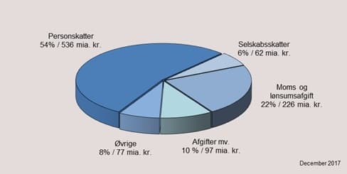 | Moms og lønsumsafgift | 21,8 | 20,0 | 20,8 | 20,6 | 20,5 | 20,4 | 20,8 | 21,8 | 22,1 | 22,1 | 21,8 | 20,5 | 21,3 | 22,0 | 22,6 |